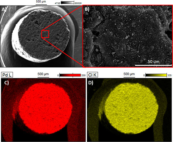 圖3:(A)活性炭的SEM分析,(B)選擇區(qū)域的放大率,(C和D)吸附氯化鈀(II)絡(luò)合離子后的EDS截面分析。