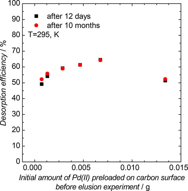 在活性炭表面存在二氯化鈀的情況下,應(yīng)該可以根據(jù)方程解吸它。因此,解吸試驗(yàn)在室溫(20℃)進(jìn)行,使用100厘米3鹽酸(濃度為1mol·kg-1)或100厘米3的高氯酸鹽酸(濃度1mol.kg-1)。必須提及的是,吸附實(shí)驗(yàn)在pH等于1下進(jìn)行,而汽提過(guò)程在pH等于0下進(jìn)行。由鈀(II)負(fù)載的活性炭樣品取自先前的吸附實(shí)驗(yàn)。通過(guò)過(guò)濾將預(yù)加載的活性炭與溶液分離,然后在60℃下干燥。接著,將干燥的預(yù)加載的活性炭與鹽酸溶液混合。解吸試驗(yàn)進(jìn)行約10個(gè)月。在前2天,觀察到溶液中鈀(II)濃度的快速增加,最終在12天后獲得恒定值。這些結(jié)果如圖4所示作為黑色方塊。為了確保這確實(shí)是最終的平衡,樣品在接下來(lái)的10個(gè)月內(nèi)留在溶液中。在此時(shí)間之后獲得的值顯示為紅點(diǎn)。過(guò)量的鹽酸是顯著的,它應(yīng)該足以溶解二氯化鈀。結(jié)果表明,平衡狀態(tài)不受時(shí)間影響,表明觀察到的狀態(tài)是最終狀態(tài)。似乎在該實(shí)驗(yàn)期間,只有約50-65%的鈀(II)物質(zhì)可以從活性炭表面洗脫。如上所述,施加過(guò)量的鹽酸。因此,一方面,不完全洗脫可以通過(guò)Pd2 OCl2的形成來(lái)解釋或活性炭表面上的另一種鈀(II)化合物。另一方面,它可能僅僅與出現(xiàn)與初始狀態(tài)不同的新平衡狀態(tài)有關(guān)。為了切斷推測(cè),進(jìn)行簡(jiǎn)單的第二次解吸試驗(yàn),其中使用來(lái)自第一次解吸試驗(yàn)的活性炭。實(shí)驗(yàn)條件和程序與第一次解吸試驗(yàn)期間的相同。觀察到鈀(II)的洗脫再次發(fā)生。在最初的24小時(shí)后,高達(dá)17%的剩余鈀(II)被解吸,而在2個(gè)月后,總解吸效率達(dá)到98.4%的水平。