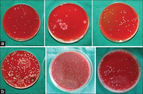 圖4:(a)厭氧培養(yǎng)48小時(shí)后活性炭刷毛的菌落形成單位。(b)厭氧培養(yǎng)48小時(shí)后的非炭鬃毛菌落形成單位。