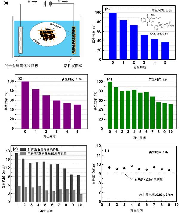 裝載RB19的活性炭在不同時間(例如,0.5小時,1.5小時和12小時)再生。還進行了連續(xù)吸附-再生循環(huán)。如在介紹圖1的B-d,再生效率(RE)高達84.1%,83.4%,和88.7%的下分別為0.5小時,1.5小時,和12個小時,再生時間來實現(xiàn),這表明(該方法的有效性圖1a顯示了方法的示意圖)。然而,在5次吸附-再生循環(huán)后,0.5小時的再生時間導致<50%RE,而1.5小時的再生時間略高于50%RE。最重要的是,12小時的再生時間顯著改善了循環(huán)性能;馗布词乖10個循環(huán)后仍可達到52.3%(圖1d)。這些結(jié)果與上電化學方法等的研究,其表明相一致,即較長的再生時間導致較高的RE。表明該方法可以回收一些活性炭的孔隙體積。