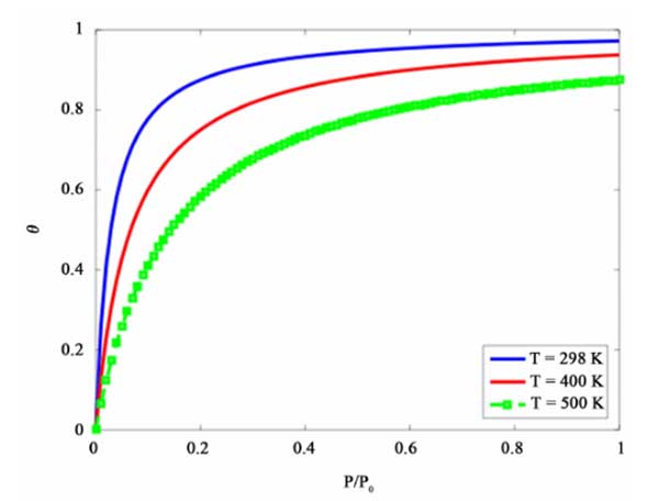 下圖(圖1)顯示了加載分數(shù)θ與氣體壓力P/P0在不同溫度之間的定量關(guān)系。BET方程是模擬活性炭上氣體吸附動力學(xué)的好方法,但它僅適用用于單組分氣體吸附。在下面的部分中,介紹了多組分油蒸氣回收的綜合模型。