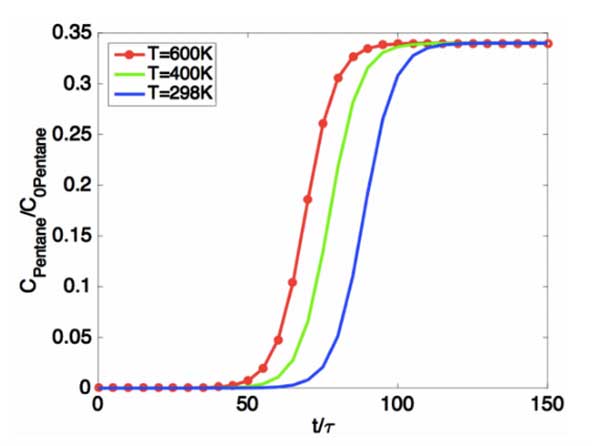 結(jié)果與討論我們已經(jīng)提出了一個綜合模型,該模型定量地預(yù)測了填充床反應(yīng)器中油蒸氣回收的吸附動力學(xué)。在該模型中,我們僅考慮軸向擴散,并使用質(zhì)量守恒方程來模擬油氣吸附的時空分布。我們假設(shè)活性炭吸附在恒溫下操作,并且與活性炭的吸附容量相比,油蒸氣濃度非常低。此外,假設(shè)油蒸氣中的組分之間不發(fā)生化學(xué)反應(yīng),因此每種組分可以作為獨立的吸附物處理。因此,多組分吸附問題可以轉(zhuǎn)化為單組分吸附問題。下圖(圖2)說明了吸附動力學(xué)的溫度依賴性。