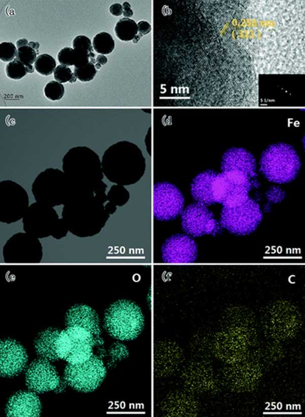 活性炭復(fù)合物的TEM圖像和相應(yīng)的元素分布示于圖5中。如圖,所制備的活性炭均接近球形,粒徑主要集中在約250nm。從圖3(b)中的HR-TEM圖像可以清楚地觀察到單個Fe 3 O 4納米顆粒的良好晶粒取向,并且該區(qū)域中的SAED圖案也顯示出Fe 3 O 4的結(jié)晶特征。如圖3(c-f)所示,其中可以清楚地觀察到復(fù)合材料由Fe,O和C元素。C的分布區(qū)域明顯大于Fe和O的相應(yīng)區(qū)域,表明鐵納米顆粒分布在活性炭的表面上。因此,結(jié)合XRD,VSM和SEM結(jié)果,我們可以得出結(jié)論,F(xiàn)e 3 O 4 納米顆粒緊密粘附在活性炭的表面上。