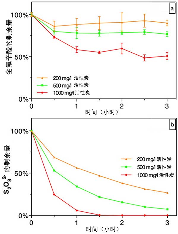 圖2。活性炭濃度對化學(xué)吸附去除全氟辛酸(圖2a)和過硫酸鹽分解(圖2b)的影響。