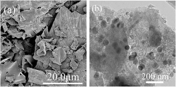 圖1:活性炭(a)的掃描電子顯微鏡形態(tài)和納米零價(jià)鐵負(fù)載活性炭的透射電子顯微鏡圖像(b)。