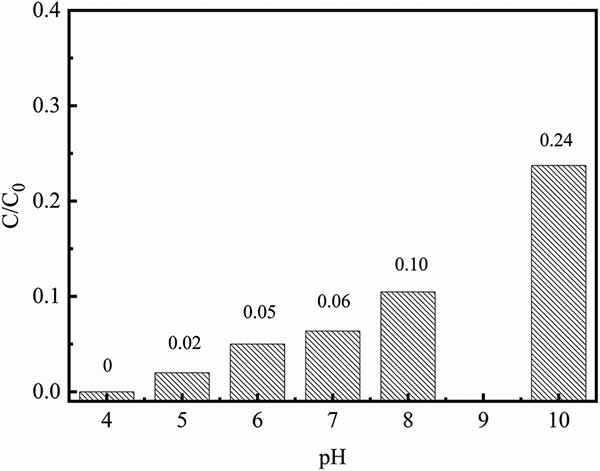 初始pH對鉻酸鹽去除能力的影響如圖3所示。發(fā)現(xiàn)鉻酸鹽的去除能力明顯受pH值在4.0-10.0范圍內(nèi)的影響。隨著溶液pH從4增加到10,鉻酸鹽去除率從100%下降到76%。在pH~4.0時(shí),HCrO 4是鉻酸鹽的主要形式。因此,在高溶液的pH值,使Cr之間的強(qiáng)烈競爭羥基(OH)應(yīng)該是低鉻酸鹽去除能力的主要原因。此外,較低的pH可有助于去除無源氧化鐵層,活性炭復(fù)合材料的表面中含有納米零價(jià)鐵用于接觸周圍的Cr(vi)溶液。因此,在所有后續(xù)的程序?qū)r溶液的初始pH設(shè)定為4.0。