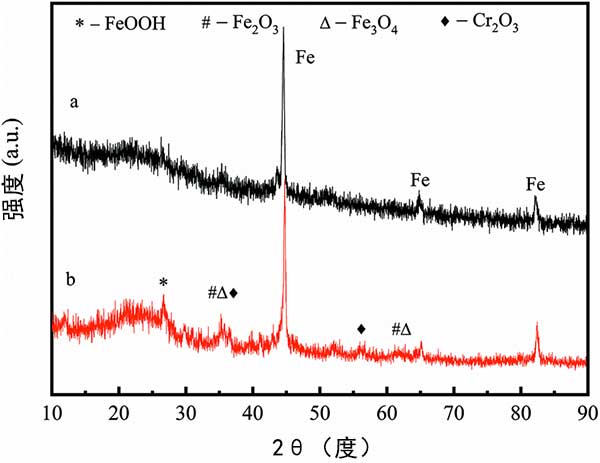 在該研究中,應(yīng)用XRD分析鉻酸鹽溶液處理后的活性炭以揭示其機(jī)制。在與鉻酸鹽溶液反應(yīng)2小時(shí)后,活性炭的XRD圖譜沒有顯著改變(圖4)。然而,與新制備的活性炭相比,可以清楚地檢測到氧化鐵晶相。XRD結(jié)果表明,而在去除鉻酸鹽期間,活性炭搭載的納米零價(jià)鐵可以被氧化成Fe(ii)和Fe(iii)化合物。