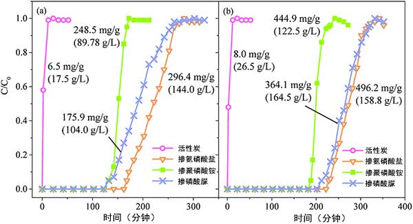 活性炭對甲苯的穿透曲線以及吸附容量如圖2所示。沒摻氮的活性炭表現(xiàn)出較差的甲苯吸附性能,吸附容量分別為6.5和8.0mg g-1。與摻氮活性炭相比,添加含氮磷酸鹽的活性炭需要更長的時間才能接近突破并表現(xiàn)出更高的吸附能力。對于在600℃下制備的活性炭,其經(jīng)含氮磷酸鹽處理的活性炭的突破時間為氨磷酸鹽活性炭>磷酸脲活性炭>聚磷酸銨活性炭,其相應的體積吸附容量為144.0,104.0和89.8g L-1,質量吸附容量分別為296.4,175.9和245.8 mg g-1,分別。與600℃相比,900℃制備的活性炭具有更高的甲苯吸收量,體積吸附容量為122.5-164.5g L -1,質量吸附容量為364.1~496.2 mg g-1。值得注意的是,可以看出氨磷酸鹽處理的活性炭具有較高的質量吸附能力,而磷酸脲處理的活性炭具有較高的體積吸附能力。這可能歸因于它們不同的堆積密度,氨磷酸鹽具有比磷酸脲更高的堆積密度。