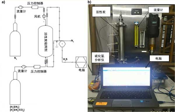 在設(shè)計(jì)為0.3米長(zhǎng)的實(shí)驗(yàn)室規(guī)模的單吸附塔單元中檢查六種活性炭對(duì)硫化氫的吸附性能。每種活性炭的高度指的是不同的活性炭載荷,分別為0.032kg,0.105kg和0.155kg。通過(guò)單次進(jìn)料H 2 S/N 2(1000 ppm H 2 S余量N 2)或H 2 S/N 2/CO 2(1000 ppm H 2)的混合氣體觀察吸附性能。圖1(A)和圖1(B)分別顯示了硫化氫吸附系統(tǒng)的示意圖和實(shí)際照片。