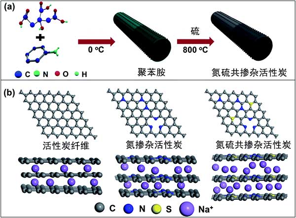 圖1:(a)氮硫共摻雜活性炭合成的示意圖,以及(b)具有不同幾何構(gòu)型和不同層間距離的三種活性炭對(duì)鈉儲(chǔ)存的行為。