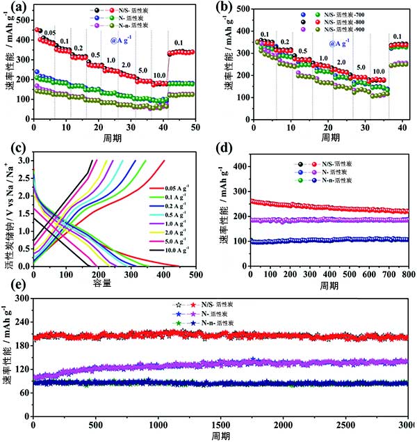為了進(jìn)一步描述制成活性炭的電化學(xué)行為,進(jìn)行循環(huán)伏安法和恒電流充電放電測(cè)試。為了證明活性炭的優(yōu)點(diǎn),還在相同的質(zhì)量負(fù)載下測(cè)試了幾種活性炭的Na儲(chǔ)存性能,圖2a顯示了在0.05至10Ag-1的不同電流密度下測(cè)試5個(gè)循環(huán)。與其他兩個(gè)樣品相比,氮硫共摻雜活性炭顯示出優(yōu)異的速率性能,在高速測(cè)量之后仍然可以恢復(fù)高比容量。對(duì)于沒(méi)有S摻雜的活性炭,當(dāng)電流密度增加時(shí),電極提供的容量降低。相比之下,不同電流密度下的恒電流充電放電曲線進(jìn)一步證實(shí)了這些速率的結(jié)果。因此,氮硫共摻雜活性炭電極表現(xiàn)出比其他對(duì)照樣品好得多的速率性能和優(yōu)異的鈉儲(chǔ)存性能。