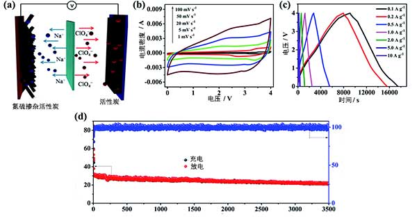 如圖3a所示,使用氮硫共摻雜活性炭作為陽(yáng)極并且商業(yè)活性炭作為陰極在電解質(zhì)溶液中構(gòu)建的鈉離子電容器裝置。在充電過(guò)程中,ClO 4-離子在活性炭的多孔結(jié)構(gòu)中被吸收,而來(lái)自電解質(zhì)的Na離子被插入到氮硫共摻雜活性炭中。放電過(guò)程與充電過(guò)程相反。在制造鈉離子電容器之前,氮硫共摻雜活性炭電極在預(yù)活化10個(gè)循環(huán)在Na離子半電池中獲得高效率,然后放電至0.01V的截止電壓。此外,研究了活性炭作為陰極的電化學(xué)性能,以評(píng)估陰極和陽(yáng)極之間的電荷平衡;钚蕴康谋缺砻娣e高達(dá)1500以上。根據(jù)活性炭陰極和氮硫共摻雜活性炭陽(yáng)極的比容量值,鈉離子電容器中氮與硫摻雜活性炭的質(zhì)量比為3:1。