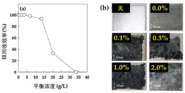 如圖4所示,在吸附物濃度為0.00-0.50%存在下的鋅回收效率至少恢復99.9%。在超過0.50%的吸附物存在下,鋅回收效率趨于迅速降低。一個電極的表面由具有不同吸附內(nèi)容物的電解質(zhì)中回收,在沒有吸附物的情況下,電極表面顯示出均勻的沉積。然而,對于0.1-2%的吸附物,電極表面看起來非常不均勻地生長。向電解質(zhì)中添加有機物改變了金屬沉積物的特征。從顯微鏡分析中,向電解質(zhì)中添加有機物導致在沉積表面上形成孔。因此,吸附物的存在降低了鋅的回收效率并導致不均勻的沉積。因此,去除吸附物必須小于0.1%。
