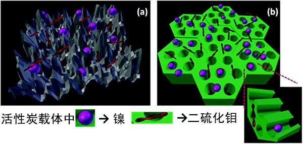 圖3:顯示了(a)活性炭(b)中孔活性炭載體上的鎳和二硫化鉬的分布。