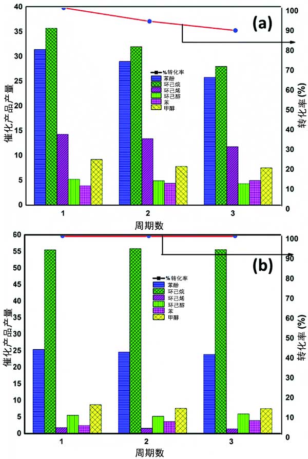 圖1:(a)活性炭載二硫化鉬催化劑(b)活性炭載鎳催化劑用于轉化愈創(chuàng)木酚的液體產物選擇性和轉換后的比較。