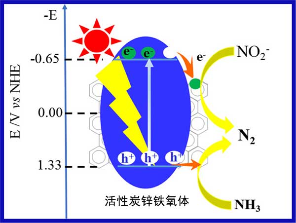 在紫外可見光照射下,基于活性炭鋅鐵氧體催化劑通過兩個步驟成功地同時去除亞硝酸鹽和氨。通過氣相色譜檢測產(chǎn)物表明在光催化過程中氮氣被釋放出來。XPS測量和鋅鐵氧體能帶結(jié)構(gòu)分析表明,鋅鐵氧體的還原電位低于亞硝酸鹽的還原電位,因此光生電子可以在照射下將亞硝酸鹽還原為氮氣。對比下高于氨的電位,因此光生空穴可以將氨氧化成氮氣;钚蕴恳饚兜募t移,光生電子空穴對的分離,亞硝酸鹽和氨的吸附,促進(jìn)光催化活性。