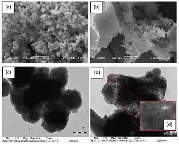 使用SEM,TEM,TGA和XRD分析活性炭的表面形態(tài),熱性質(zhì)和結(jié)晶度。用作活性炭前體的圖像(圖1a,c)顯示其典型的形態(tài)為花椰菜樣結(jié)構(gòu),這種形態(tài)似乎是由于與其中摻雜地嵌入無(wú)序聚合鏈形成的。然而,聚吡咯的球形結(jié)構(gòu)通過(guò)碳化過(guò)程被破壞,導(dǎo)致粗糙,粗糙的表面由不規(guī)則的尖角和剝離狀顆粒組成,在SEM圖像中幾乎沒有孔隙的跡象。活性炭聚吡咯的TEM圖像如圖1d所示表示觀察到均勻分布的微孔。此外,TEM圖像描繪了高度豐富和對(duì)稱的孔隙,表面積和微孔率的值對(duì)應(yīng)于該活性炭。發(fā)現(xiàn)隨著活化劑用量的增加,表面積增加,孔隙率增加。
