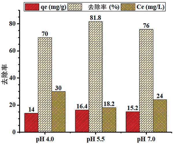 圖3:pH對(duì)活性炭的吸附容量和鉛去除百分比影響。