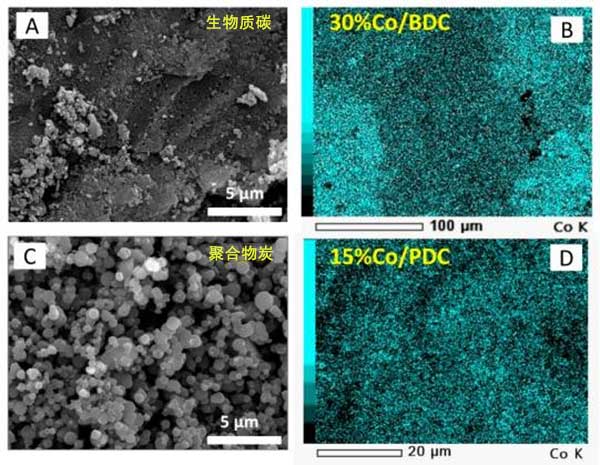 使用掃描電子顯微鏡(SEM)觀察由植物殼和酚醛樹脂的熱解獲得的活性炭的表面形態(tài),并分別在圖1A,C中示出?梢钥闯觯煌奶记绑w產(chǎn)生不同的表面形態(tài)。生物質(zhì)衍生的碳顯示出剛性和致密的結(jié)構(gòu),這是典型的木炭特征。而聚合物衍生的碳呈現(xiàn)具有粒子網(wǎng)絡(luò)的碳球,在球體之間產(chǎn)生大的空隙。然后將兩種活性炭用作氧化鈷的載體。為了觀察金屬氧化物在活性炭上的分散,進(jìn)行了SEM與能量色散X射線(EDX)的元素映射。圖1B,D表示裝載在兩種材料中的氧化鈷的代表。所有都顯示鈷材料(在青色中顯示)在活性炭中的均勻分散。這表明通過浸漬方法中描述的簡單化學(xué)計(jì)量計(jì)算很好地實(shí)現(xiàn)了元素鈷的目標(biāo)負(fù)載。換句話說,上述結(jié)果清楚地顯示了制備氧化鈷活性炭的成功制備步驟。