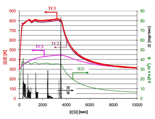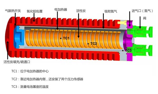 排出壓力約為3.5MPa的實(shí)驗(yàn)結(jié)果如圖4所示。250秒后,加熱功率為500W,中心溫度超過476℃,而電池底座溫度則為76℃。然而,將電池達(dá)到其穩(wěn)態(tài)溫度分布需要大約60分鐘,其中電池基座中的溫度為166℃。活性炭的溫度不允許超過526℃。 60分鐘,加熱功率逐漸降低,以保持最高溫度低于526℃,壓力高于3.5MPa。由于電池基座的溫升速率隨時(shí)間降低,輸送的氮量也減少了。因此,在15分鐘后結(jié)束放電階段僅從活性炭吸附池釋放4.6g氮。圖4中的冷卻階段持續(xù)約100分鐘,并且如果放電階段在15分鐘后結(jié)束(此時(shí)基礎(chǔ)溫度僅為126℃),則可以減少冷卻階段;钚蕴恐械募訜岷屠鋮s速率以及溫度分布與數(shù)值分析估計(jì)的相似。這表明簡化的數(shù)值傳熱分析為吸附池中的傳熱提供了令人滿意的估計(jì)。