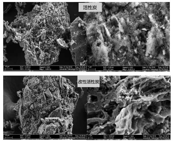 原始和改性活性炭的形態(tài)行為總結(jié)在圖2中。兩種不同的放大倍數(shù)(10μm和1μm)用于檢測官能化前后的表面形態(tài)。很明顯,活性炭在官能化之前由不規(guī)則的異質(zhì)表面組成。在用離子液體進行表面改性后,沒有觀察到對結(jié)構(gòu)的明顯損壞。表面粗糙度從離子液體處理逐漸得到改善,離子液體處理與引入含氧官能團有關(guān)。此外,通過在官能化后在結(jié)構(gòu)中引入小的和更大的孔,已經(jīng)批準了活性炭的無定形性質(zhì)。據(jù)信這些微球是高比表面積和總孔體積的原因。改性活性炭在其結(jié)構(gòu)中顯示出更多的孔隙,這意味著除了制備方法之外,活性炭的形態(tài)很大程度上取決于所用的氧化劑。