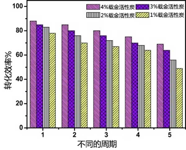 為了量化活性炭載金催化劑的催化活性,可以使用轉(zhuǎn)換頻率作為度量。轉(zhuǎn)換頻率可以定義為使用每克活性炭每單位時(shí)間轉(zhuǎn)化成產(chǎn)物(對(duì)氨基苯酚)的反應(yīng)物分子(對(duì)硝基苯酚)的數(shù)量;钚蕴枯d金催化劑是可回收的,每次運(yùn)行后,通過(guò)離心分離催化劑。即使使用5次,催化劑的轉(zhuǎn)化率最多降10%。這通過(guò)繪制百分比轉(zhuǎn)換效率與循環(huán)次數(shù)來(lái)顯示,如圖3示。
