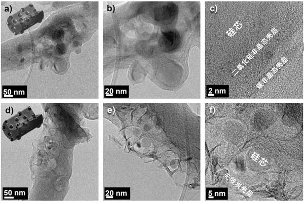 圖1:硅載納米纖維(a-c)和納米纖維的靜電紡絲(d-f)的透射電子顯微鏡成像。
