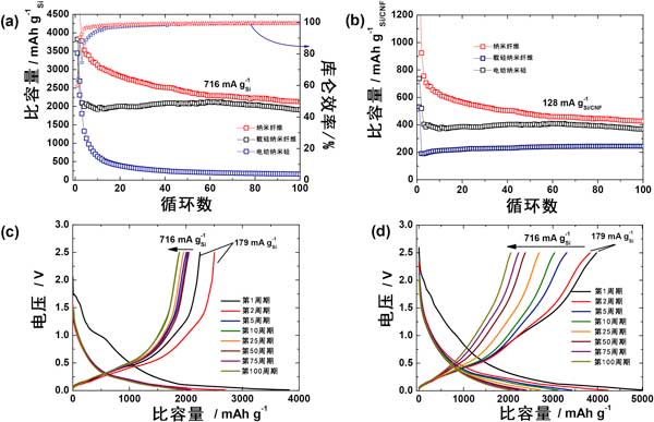 如圖4所示,從第一個循環(huán)的電壓分布中看出,兩個陽極的第一個循環(huán)的額外貢獻來自不可逆的固體電解質(zhì)界面層形成和電解質(zhì)分解。對于電化學(xué)表征,在紐扣電池配置中使用鋰金屬作為對電極對所有硅陽極進行恒電流充電和放電。裸露的十億分之一硅陽極在第一個循環(huán)中提供3445mAhg的放電容量,庫侖效率約為65%。從第二個循環(huán)開始,二氧化硅的硅載納米纖維陰極的比容量值急劇下降至2600mAhg,而納米纖維的靜電紡絲陽極顯示出邊際下降,比容量為4000mAhg-1,庫侖效率均為約91%。比容量的急劇下降可歸因于二氧化硅的硅載納米纖維中的二氧化硅殼在第一次循環(huán)中不可逆鋰化。