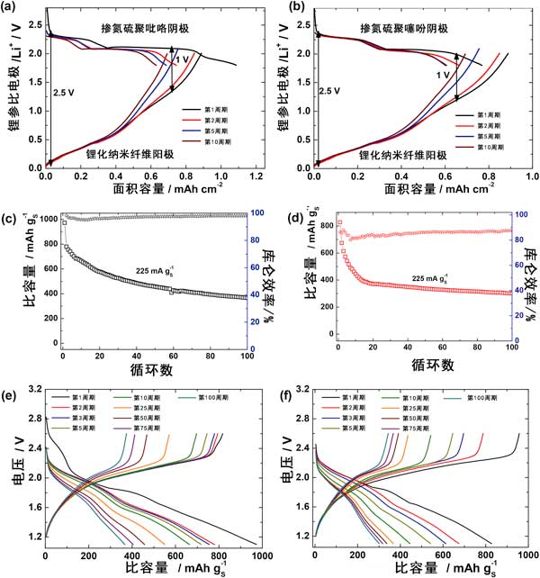 為了證明設(shè)計單個電極的可行性和相關(guān)性,用鋰化硅/納米纖維陽極代替金屬鋰以實現(xiàn)0.鋰-硅/硫全電池。為此目的,陰極和陽極都應(yīng)在半電池測試中實際實現(xiàn)的面積容量方面進行平衡。在全電池配置中,硅陽極的脫鋰與硫陰極的鋰化密切相關(guān)。換句話說,硫陰極的放電將遵循硅陽極脫鋰的潛在和容量分布。