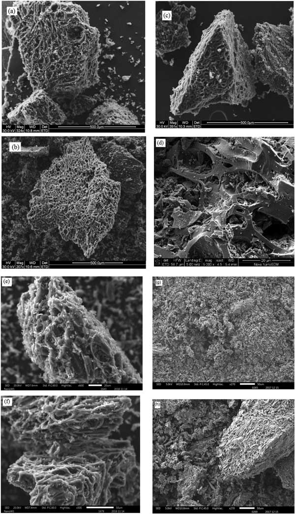 掃描電子顯微鏡圖像顯示在圖1a-h中。活性炭的磷酸處理導致具有可見孔隙率的材料(圖1a-c)。然而,仔細觀察后,孔隙結構和尺寸是不同的。20%濃度改性后的活性炭具有稍微細長的孔,40%表現(xiàn)出均勻的圓形孔,而60%顯示出細長和圓形毛孔的混合。這些觀察結果表明,不同濃度的磷酸活化的活性炭具有不同的物理屬性。在這種情況下,磷酸是活化劑,并且在加熱時產(chǎn)生孔道,因為它從碳中逸出,從而帶走一些萃取劑。圖1d描繪了具有小孔的粗糙紋理,圖1e顯示了類似巢的類型的孔,圖1f顯示了孔的破壞和變寬。孔結構和孔體積的變化可歸因于活化劑的強度增加。濃度較高的硝酸會破壞表面基團。因此,需要使用最佳濃度的活化劑來防止損害吸附劑的表面特性。濃度太高可能導致結合官能團的提取,使吸附劑吸附性差。