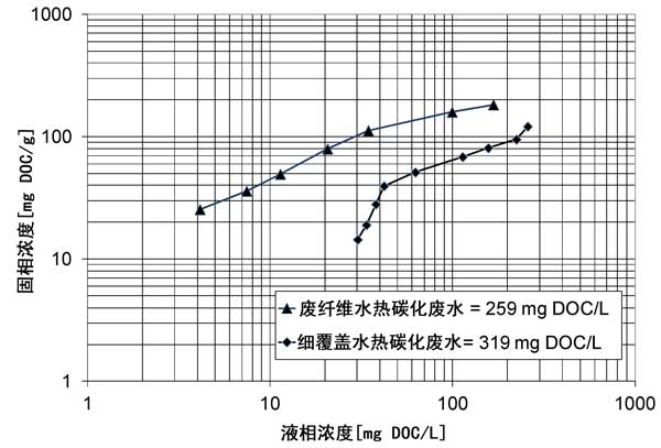 圖1:預處理過的水熱碳化廢纖維和細覆蓋處理水的總體等溫線的比較。