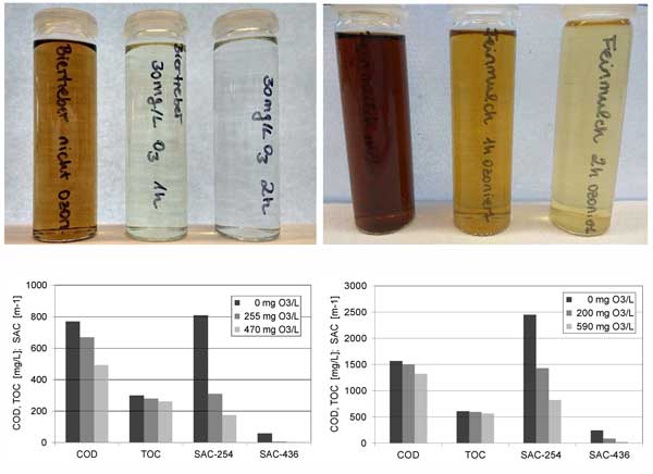 圖2:經過臭氧化處理對預處理的水熱碳化用過的纖維廢水(左)和細覆蓋廢水(右)的影響。
