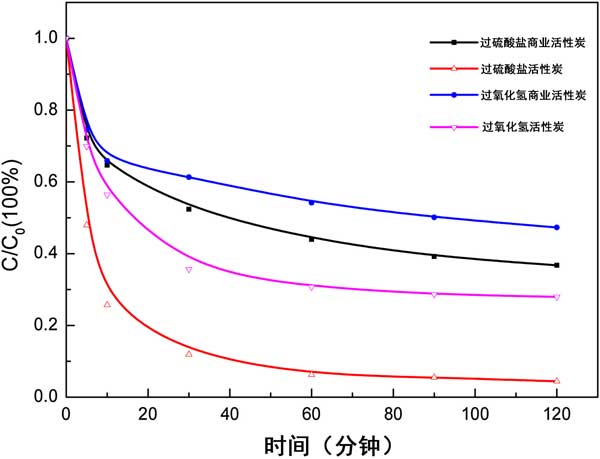 圖3 顯示了兩種活性炭的正交組合,并且兩種氧化劑(H 2 O 2和過硫酸鹽)在降解苯酚方面有顯著差異。在H 2 O 2為氧化劑的實驗條件下,活性炭對苯酚的降解作用在120min內(nèi)是商業(yè)活性炭的1.34倍 。然而,當過硫酸鹽用作氧化劑時,活性炭對苯酚的降解作用在120 分鐘內(nèi)是商業(yè)活性炭的1.51倍。實驗表明,我們研發(fā)的活性炭更好。在前30 在降解反應(yīng)的最短時間內(nèi),活性炭的優(yōu)勢比商業(yè)活性炭更為突出,就降解率而言,前者是后者的1.87倍。在過硫酸鹽作為氧化劑對苯酚的降解在120 分鐘內(nèi)是H 2 O 2對Ph的降解的1.33倍 。因此,在隨后的實驗中,選擇活性炭和過硫酸鹽作為實驗對象。