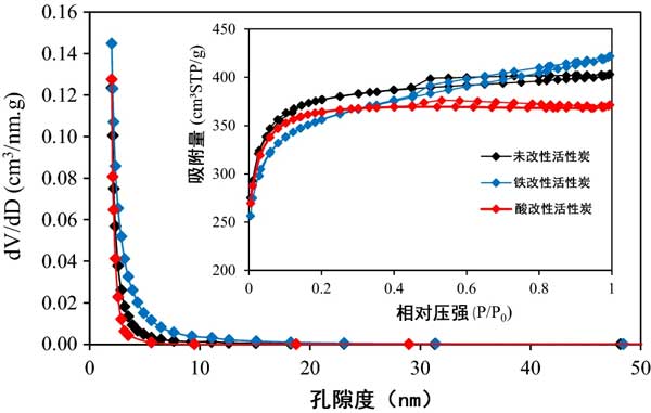 圖1顯示了活性炭纖維的孔徑分布。如圖1所示,活性炭纖維的孔徑在1至20nm之間。同時(shí),幾種活性炭的所有氮吸附/解吸曲線均與IV型吸附等溫線相對(duì)應(yīng)。由于活性炭?jī)?nèi)中孔定義為2–50 nm,在未經(jīng)改性和經(jīng)過改性的活性炭是微孔的,但HNO 3改性擴(kuò)大了孔的結(jié)構(gòu)并導(dǎo)致了中孔的結(jié)構(gòu)。因此,活性炭顯示出微孔/中孔結(jié)構(gòu)特征,并且可以用作在水中吸附砷離子的有前途的材料。