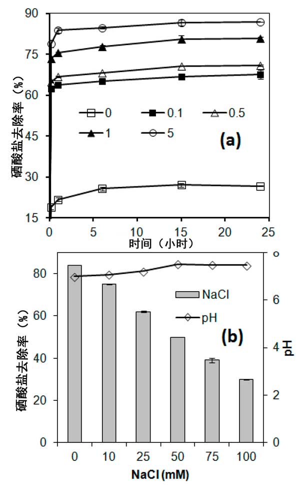 圖2:(a)銅涂層劑量[0,0.1、0.5、1.0和5.0 mmol 的載銅活性炭]對(duì)硒酸鹽吸附的影響,(b)溶液對(duì)硒酸根在銅包被的活性炭上的吸附的離子強(qiáng)度,以及吸附后溶液的pH,初始pH約為7.0。