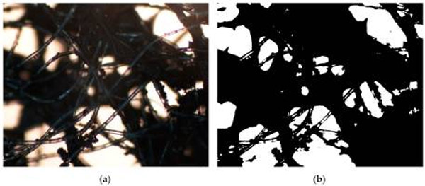 活性炭介質(zhì)250倍放大的顯微照片,然后用數(shù)值計(jì)算出與圖像其余部分相比具有較暗陰影的區(qū)域的面積(被活性炭介質(zhì)覆蓋的區(qū)域)。首先,我們使用常規(guī)的多通道和彩色圖像轉(zhuǎn)換為灰度圖像,然后生成圖像,其中每個(gè)像素的值均為0(白色像素)或1(黑色像素)(圖1)。接下來(lái),我們應(yīng)用例程,對(duì)于給定的灰度圖像,該例程確定由黑色像素簇覆蓋的整個(gè)灰度圖像的比例。這種方法使我們能夠粗略評(píng)估活性炭復(fù)合材料中活性炭附聚的均勻性,而無(wú)需考慮基礎(chǔ)非織造布的不均勻性,因?yàn)槔淌÷粤送该鱌ET纖維。