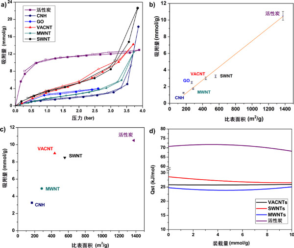 兩種吸附劑在25°C下的二氧化硫吸附等溫線如圖3a所示。活性炭的吸附容量可歸因于微孔的存在。如圖分析所示,微孔占活性炭的總可用表面積的幾乎89.5%。在1bar時(shí),碳納米角的二氧化硫攝入量最低,其次是碳納米管和氧化石墨烯。在圖3b中,繪制了在1bar下SO 2的吸附量與吸附劑的BET比表面積的函數(shù)關(guān)系。在1 bar時(shí),BET比表面積和SO 2吸附之間幾乎存在線性關(guān)系。在相對壓力P/P 0小于0.3的近環(huán)境條件下,發(fā)現(xiàn)氧官能團(tuán)的影響更為明顯。在我們對單壁碳納米管的TEM測量中,我們看到了少量的多壁碳納米管和其他催化劑雜質(zhì)的存在。這些異物的存在可能是SWNT中觀察到的SO 2吸收率低的原因之一。