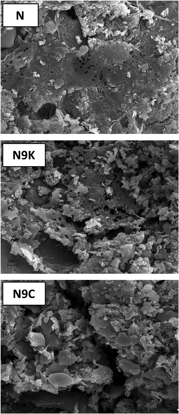 活性炭和經(jīng)改性后獲得的樣品的化學(xué)成分。兩種修飾均導(dǎo)致灰分含量以及結(jié)構(gòu)中特定元素的變化,其中這些變化對N9K樣品而言更大。起始活性炭(N)暴露于碳酸鉀會導(dǎo)致礦物質(zhì)(灰分)的顯著下降,同時(shí)氫含量下降兩倍(可能是碳結(jié)構(gòu)芳構(gòu)化的結(jié)果)由于活性炭顆粒的表面氧化,增加了氧氣量。還值得注意的是,灰分含量比在CO 2中退火的N9C樣品低了近10倍。大氣層。N9K中的灰分很可能是由于活化后將其用5%的鹽酸溶液洗滌而導(dǎo)致的。圖1所示的SEM圖像也證實(shí)了各個(gè)活性炭的質(zhì)地和形態(tài)多樣性?梢钥闯,根據(jù)制備程序,樣品在尺寸,形狀以及孔的數(shù)量或排列方面存在顯著差異。特別是在活性炭和N9C樣品中可以觀察到的較亮片段可能是其結(jié)構(gòu)中存在灰分(礦物質(zhì))的結(jié)果。