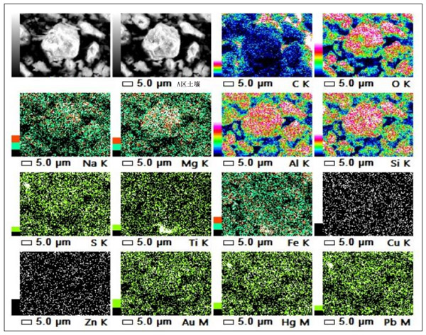SEM-EDS測試使用了三個樣本,即A區(qū)域樣本,B區(qū)域樣本和原始土壤樣本。分析了這三個樣品。尋找的參數(shù)是充當(dāng)污染物的重金屬元素。該測試的結(jié)果顯示了土壤中存在的元素的質(zhì)量百分比。掃描電鏡是一種用于表面觀察的工具,其焦點(diǎn)深度大于光學(xué)顯微鏡,可以直接觀察復(fù)雜的表面而無需復(fù)制。SEM圖像顯示出樣品的形態(tài)狀態(tài),顯示出大小不規(guī)則的團(tuán)塊。同時,EDS分析非常適合揭示樣品中的化學(xué)元素和化合物。EDS的元素映射將為對象表面上的每個元素賦予不同的顏色,并定量分析每個元素的百分比。