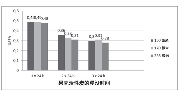 活性炭浸入進(jìn)行1、2或3天。從圖中可以看出,浸泡1天的FFA值在0.4-0.5%的范圍內(nèi)。浸泡兩天的FFA范圍不同(0.3-0.4%)。此外,浸泡3天的油中FFA很低,為0.2-0.3%。根據(jù)這項研究,發(fā)現(xiàn)活性炭可降低食用油的FFA。重要的是要強(qiáng)調(diào)指出,使用農(nóng)業(yè)廢料制成活性炭來處理水性廢水(主要作為替代性吸附材料)可能是一個優(yōu)勢,因為它們可以去除廢水中的惰性污染物,并且可以很大程度地減少因不適當(dāng)處理這些廢水而造成的環(huán)境影響。