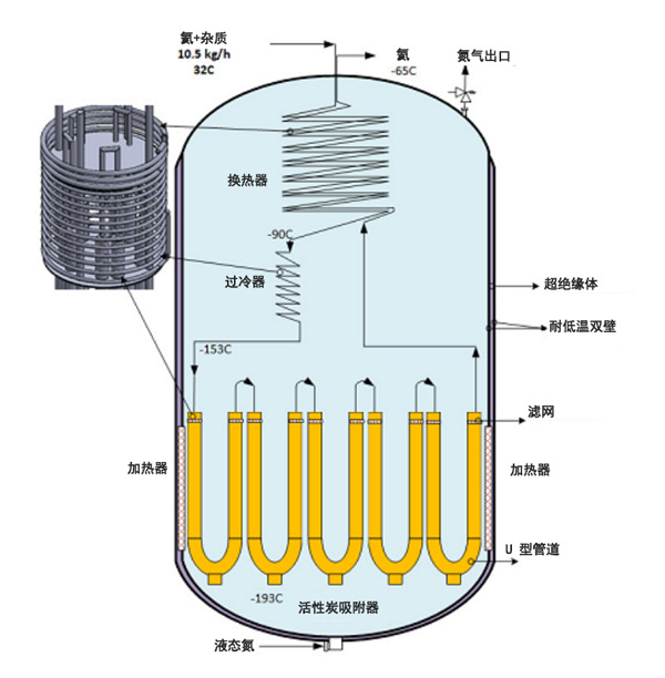 低溫單元是一系列熱交換器,稱為冷阱和活性炭吸附柱,它們浸入裝有液氮的容器中。該系列熱交換器是氦氦換熱器(HE的管中管類型)。過冷器將氦氣溫度降低至-153°C。吸附器將一根裝有活性炭的U型管立柱。如圖2所示,在色譜柱周圍安裝了一個電加熱器以進(jìn)行再生。低溫容器是雙壁容器,其中壁之間的間隙中充滿了超絕熱材料。該容器裝有液氮,并將吸附過程保持在低溫(±180°C)下。