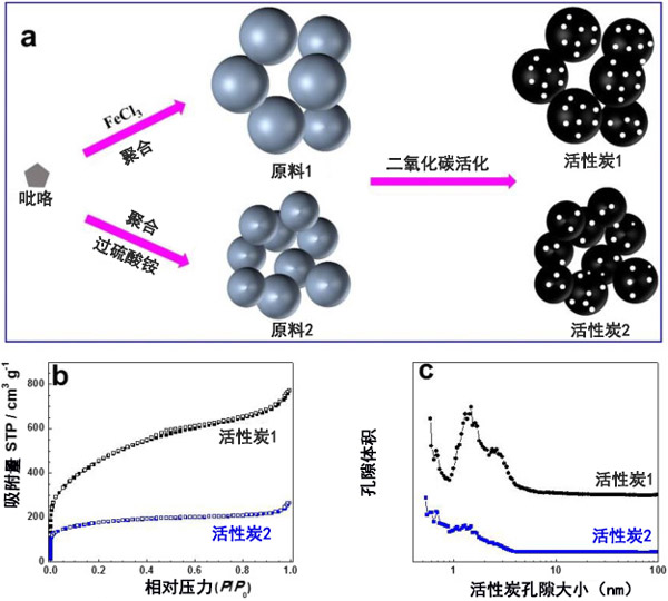 圖1和一個示出了活性炭材料的制備方法。首先,使用不同的氧化劑(FeCl 3和過硫酸銨)通過吡咯單體的氧化聚合反應合成了兩種樣品。其次,對原材料進行二氧化碳活化處理,以制備具有高孔隙率的活性炭。進行氮吸附測量以獲取關于他們的比表面積的數(shù)據(jù)。