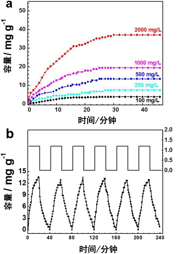 圖3:(a)在不同的NaCl濃度下活性炭的電吸附動力學,(b)活性炭電極在NaCl電解質(zhì)中的電吸附和再生循環(huán)。