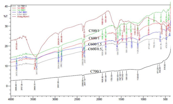 對于峰的強(qiáng)度,活化溫度在降低強(qiáng)度中起重要作用。較高的溫度將產(chǎn)生具有較少官能團(tuán)的活性炭。最高活化溫度樣品顯示幾乎平坦的光譜。同時,對于活化劑定量,效果很小。比率從0.5增加到1.5似乎對樣品的化學(xué)性質(zhì)沒有任何影響,因?yàn)槿齻光譜相似。