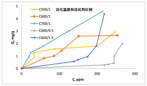 圖3顯示了鈣離子的吸附等溫線。等溫線表示分類的I型或II型。較低溶液濃度下的小肩部可能暗示了鈣離子微孔填充的單層吸附飽和。這表明孔表面與鈣離子之間的相互作用較強(qiáng)。活性炭的低孔隙度仍表示III型等溫線,因?yàn)闆]有明顯的微孔可以被鈣離子填充,而不是外表面和大孔。
