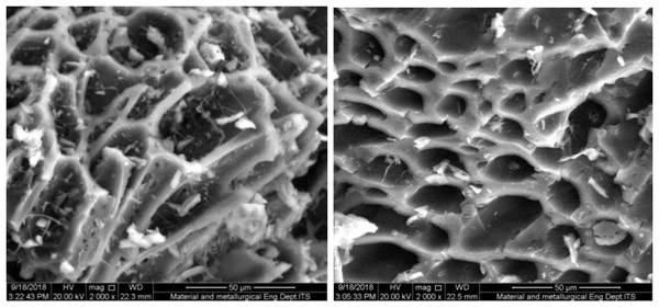 通常,由碳化過程形成的活性炭具有粗糙的表面結(jié)構(gòu),其孔徑不會太大以至于會影響吸附能力(圖1)。粒度和表面積對吸附劑很重要,因為粒度會影響吸附能力。由該圖可知,通過RSS碳化處理得到的活性炭的孔徑為40μm左右,未改性,使用活化液進行改性后,為<20μm。這表明,活化液的浸漬在孔的形成中起著重要的作用。促進更多的孔隙形成?偙砻娣e影響總吸附容量,從而提高吸附劑去除廢水中有機化合物的效率。