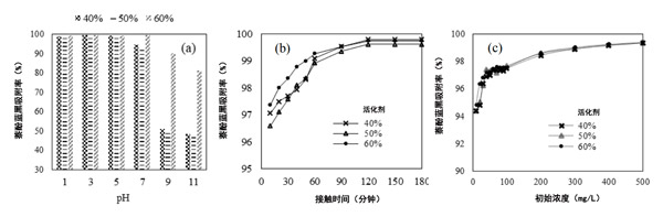 溶液PH影響活性炭的表面電荷。因此,它是控制活性炭吸附過程的重要因素之一。圖2(a)中描述了萘酚藍黑在以40%,50%和60%的活化劑制備的活性炭上的吸附。在所研究的pH范圍內(nèi)(pH介于1和11之間),萘酚藍黑在活性炭上的吸附是pH依賴性的,尤其是在pH 5和11之間。在低pH值下,活性炭表面帶有凈正電荷。pH的增加導(dǎo)致凈正電荷的減少和凈負電荷的增加。萘酚藍黑是具有負電荷的陰離子染料。在pH值為3時,它會在活性炭表面的活性位點(即,官能團)與被吸附物分子(即,萘酚藍黑)之間引起靜電吸引;钚蕴康幕钚圆课慌c萘酚藍黑色分子之間的靜電排斥作用占主導(dǎo)。因此,可以得出結(jié)論,將萘酚藍黑色吸附到活性炭上的pH值選擇為3。另一方面,使用60%活化劑的活性炭吸附時,萘酚藍黑的吸附量比使用40%活化劑活化的活性炭吸附的高,這是由于活性炭產(chǎn)生了更多的孔,盡管在pH 1-3下差異不明顯。