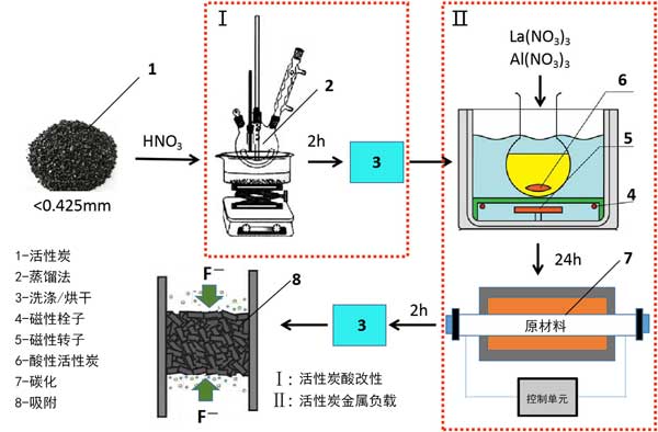 鑭鋁改性活性炭的制備包括兩個(gè)步驟:酸改性過程(I)和鑭-鋁加載過程(II)。方法I涉及特定質(zhì)量分?jǐn)?shù)的硝酸(HNO3)。將HNO3和活性炭混合在燒瓶中,將燒瓶置于75°C的恒溫水浴中保持2小時(shí)。然后,將活性炭洗滌至中性并在100℃下干燥3小時(shí),從而獲得酸改性的活性炭。用鑭(NO3)3·2H2O和鋁(NO3)3加載鑭和鋁的酸改性活性炭。將10g酸改性活性炭在100mL鑭(NO3)3·2H2O和鋁(NO3)3的混合溶液中攪拌24小時(shí)。然后,將固體產(chǎn)物在氮?dú)庀掠?00°C的管式爐中碳化兩小時(shí),冷卻至室溫后,完成鑭鋁改性活性炭,制備和吸附過程示意圖如圖1所示。鑭鋁改性活性炭將用作氟化物的吸附劑。