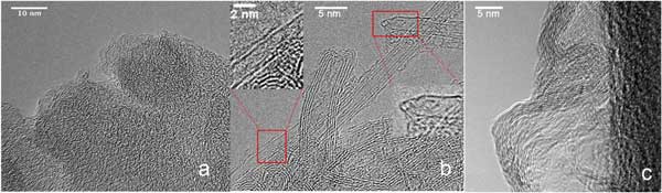 選擇了三種活性炭,代表三種不同的孔幾何形狀,同時保留了化學(xué)均一的吸附表面和可比較的孔徑。選定的樣品是由隨機排列的石墨層組成的活性炭,具有狹縫孔幾何形狀的碳化鈦衍活性炭和具有圓柱孔幾何形狀的活性炭納米管樣品。對活性炭納米管進行熱處理,以去除端蓋,并使氣體進入內(nèi)部孔隙。選擇加熱條件以將活性炭納米管的開孔率和BET表面積調(diào)整到與其他兩個碳樣品相當(dāng)?shù)乃,同時還清潔表面并去除雜質(zhì)。所有三個樣品的特征如下:使用透射電子顯微鏡(TEM)圖1證明了這些材料的孔幾何形狀的差異。