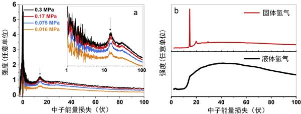 在非彈性中子散射實驗中,使用普通氫在三個碳原子上的原位氫劑量(圖2)。圖2a顯示了鈦活性炭中氫氣在0.3MPa壓力下的INS光譜,表明在0meV處有清晰的峰歸因于固定(固態(tài))和部分移動(液態(tài))氫的彈性和準(zhǔn)彈性散射。在圖2中以對數(shù)能量軸查看的光譜a顯示了在不同壓力負載下,活性炭上吸附的H2在14.7meV處的旋轉(zhuǎn)峰。我們先前在石墨活性炭上出現(xiàn)轉(zhuǎn)子峰的情況,該峰對應(yīng)于固體中從對向或從正向旋轉(zhuǎn)躍遷的氫。14.7meV峰的存在表明氫分子處于以下狀態(tài):它們在三個維度上固定并且表現(xiàn)為自由轉(zhuǎn)子,因此近似于固體。